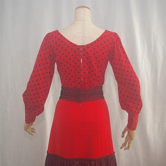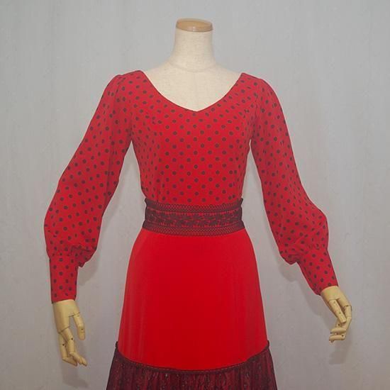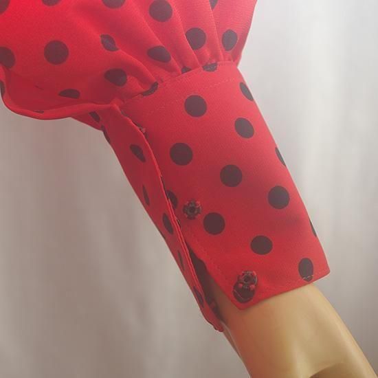 Vネックブラウス カフス袖 水玉レッド×ブラック