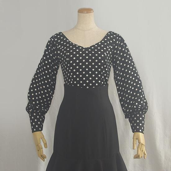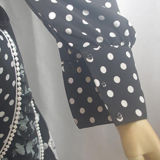 Vネックブラウス カフス袖 水玉ブラック×ホワイト