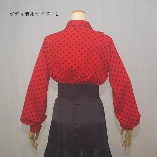 胸元フリル6cmカフスブラウス シャツカラー 水玉レッド×ブラック(裏地付き)