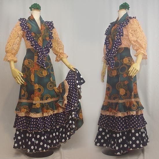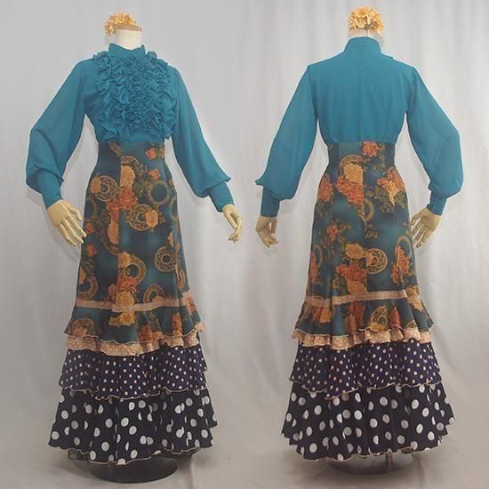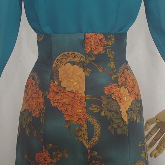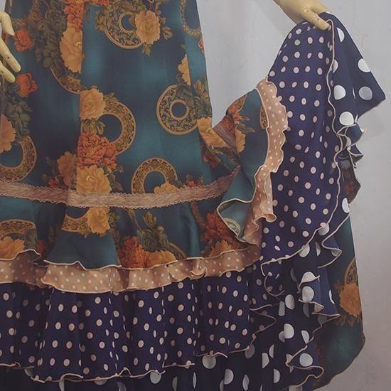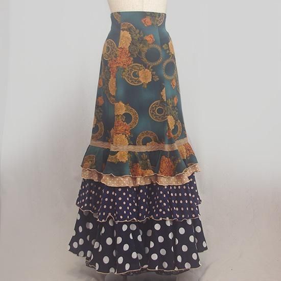 ブルー〜グリーンをベースにいろんな生地を長さ違いで配したハイウエストファルダ